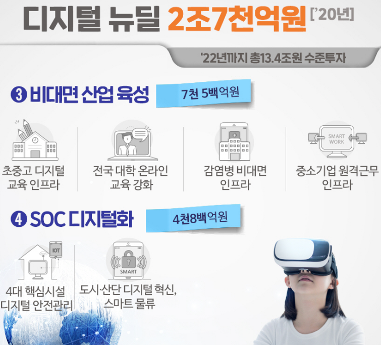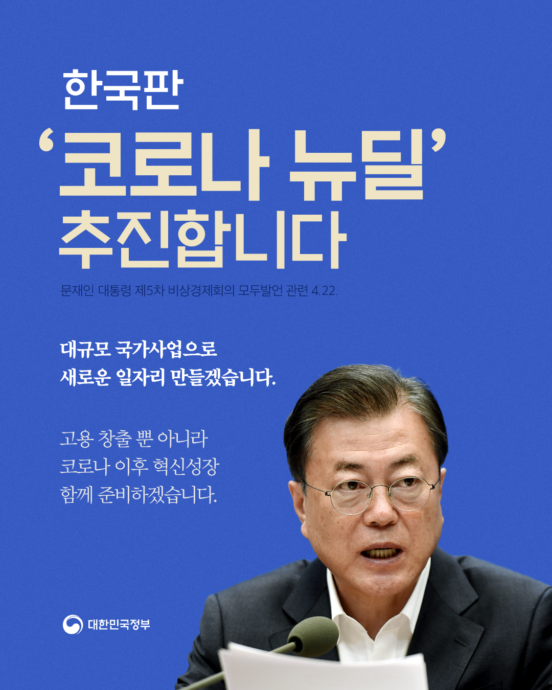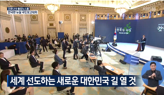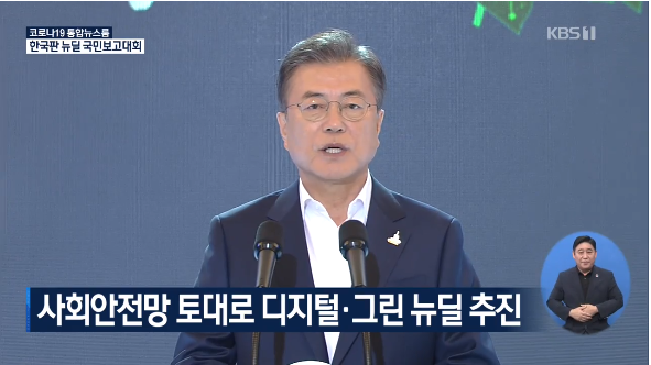 "포스트 코로나시대가 빠르게 새로운 길을 재촉하고 있습니다. 선도형 경제 포용 사회전환은 시대적 과제입니다 .다른 나라보다 앞서가기 위한 국가 전략이 "한국판 뉴딜 정책"입니다. 디지털 뉴질과 그린뉴딜 주축으로세워 세계사적 흐름을 앞서가서 선도 국가로 나아가겠습니다.