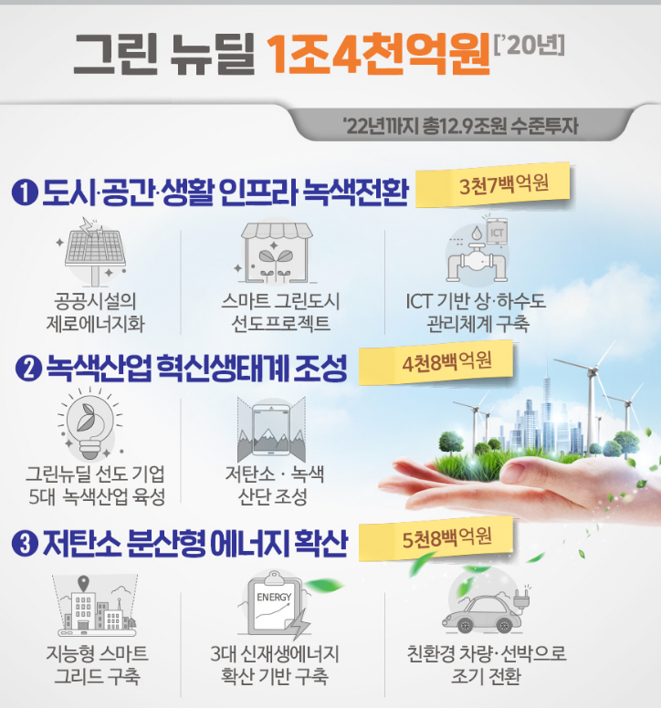 그린뉴딜 정책의 미세먼지 해결등 우리삶의 질을 높여줄뿐아니라 우리의 산업 경쟁력을 높여주고 녹샌산업 일자리의 창출해낼것입니다.