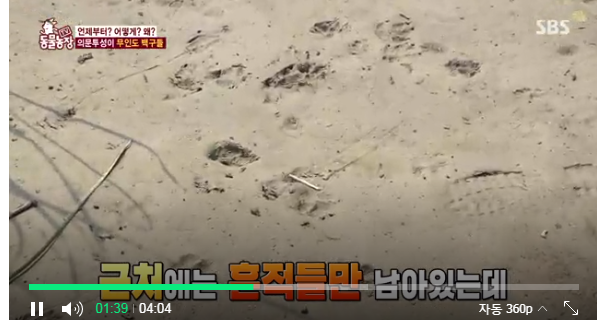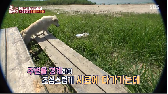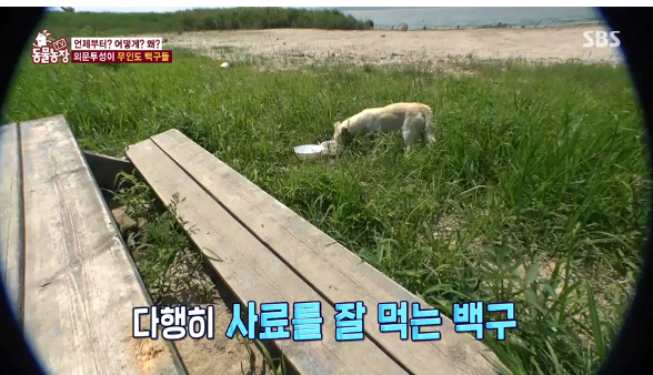 동물농장 제작진들이 촬영 하러 들어갔을 때에 솟벌섬에 들어가기도 힘들어서 빙둘러서 10분여 만에 솟벌섬에 발여 들여놓았고 개들을 찾았으나 발자국 흔적만 있지 개들을 직접 목격하지 못한 채 사료만 놓고 나왔습니다. 그리고 관찰 카메라로 확인하는데. 개들은 사람이 없자 경계를 풀지 않으면서 사료로 놓아둔 곳으로 한 마리 개가 먼저 관찰되고 나머지 한 마리도 나타나서 사료를 허겁지겁 먹는 모습이었다. 그런데 한 마리는 경계가 심한지 사료를 먹지 않는 모습이었다.