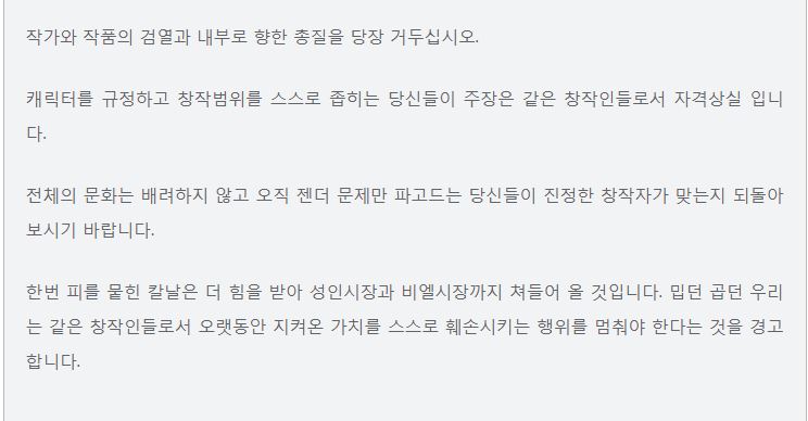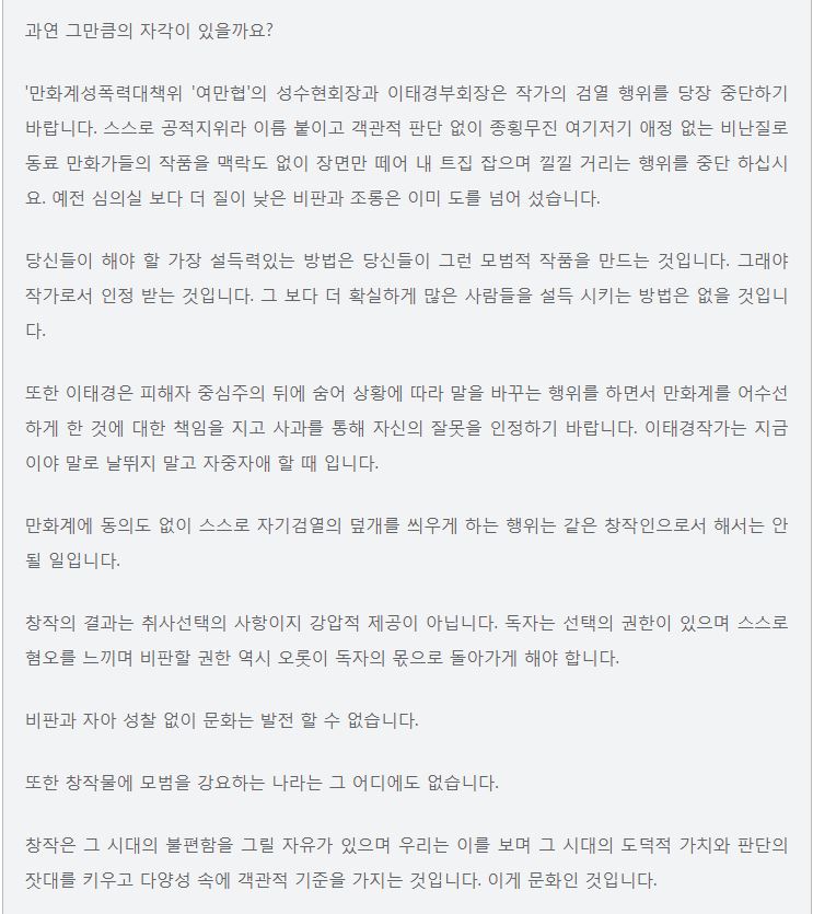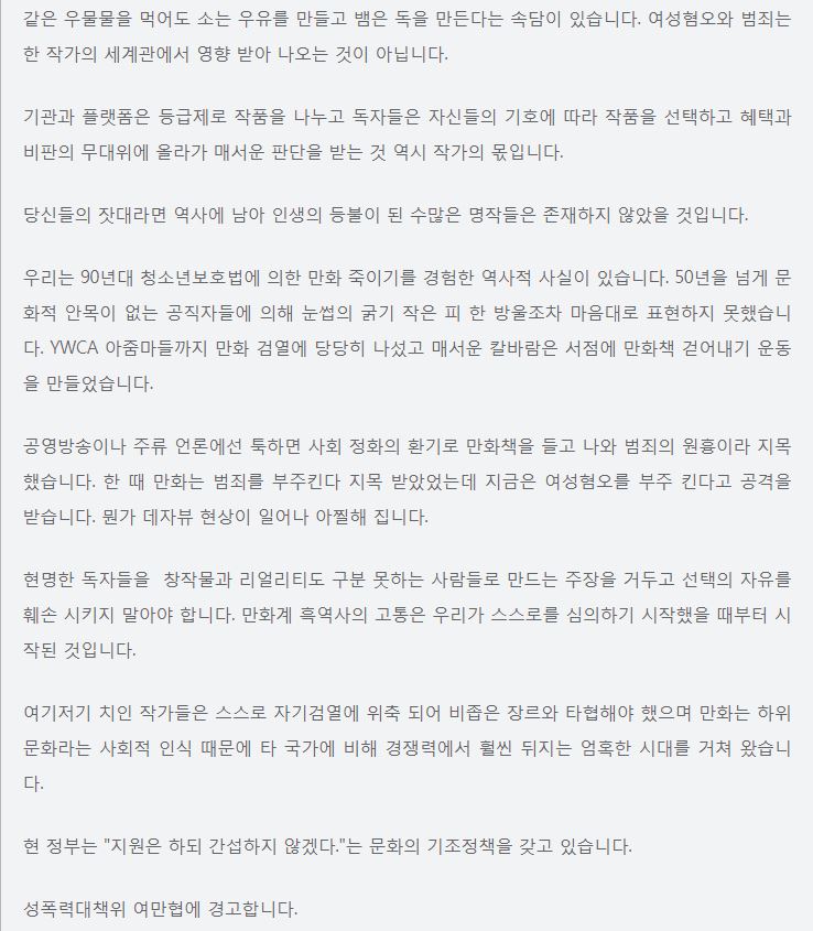 현재 기안84의 여성혐오. 여성비하 논란이 있습니다. 거기에대해서 제1대 세계웹툰회장을 맡은바 있는 원수연 작가가 입을 열었습니다 자신의 SNS를 통하여 입장을 표명하였는데요. 대체 누가 이들에게 함부로 동료 작가들을 검열하는 권한을 준것일까요? 그는 "작가들이 같은 작가의 작품을 검열하고 연재 중단 시위를 벌이는 초유의 사태가 만화계 일각에서 벌어지고 있습니다라고 시작하며 운을 떼었다. 이어 "현재 여성단체들과 결을 같이하고 있는 이들의 연재중단 운동은 만화계 역사에서 가장 치욕스런 암흑기를 다시 오게하는 폐륜적인 행위입니다 라며 높은 수위의 피판을 하였다 원수연작가는 만화계 성폭력대책위 "연만협"의 성수현 회장과 이태경 회장에게 "작가의 검열 행위를 당장 중단하기 바랍니다"라며 "예전 심의실보다 더 질이 낮은 비판과 조롱은 이미 도를 넘어섰다고 강조하였다.