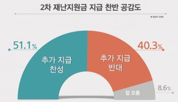 여론조사 전문기관은 성인500명을 대상으로 2차 재난지원금 지금 찬반 조사를 한 결과 과반수 이상이 2차 재난지원급 찬성을 투표하였으며 약 40%가 추가 지급에 반대하였다, 현재 사회적 거리두기 2단계가 적용되면서 고위험 시설로 등록되어있는 노래방,주점,pc방 등자영업자들이 어려움을 곁고있으며 이미 많은 자영업자들과 시민들이 코로나로 인해서 대출과 신용카드 마이너스 카드등 사용증가되고 있는 만큼 이번 2차재난지원금을 필요로 하는 시민들이 많이지고 있는 상황이다.