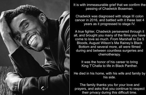 블랙팬서 채드윅 보스만 공식 SNS상에 따르면 2016년에 대장암 3기로 진단받은후 4기로 이어졌으며 4년간 투병생활을 이어왔다. 보통 암같은 경우에는 유전영향도 있지만 암 유전과는 관계는 없는것으로 보도되었고 채드윅 보스만은 가족들이 옆에서 지켜보는 가운데 집에서 숨을 거두었다고 SNS 상으로 공식보도 하였다. 채드윅 보스만은 2008년 영화 "더 익스프레스"단역으로 출연하여 지속적으로 경력을 쌓다가 2018년 영화"블랙팬서"에서 티찰라 왕 역할을 맡으면서 아카데미 남우주연상 후보까지 올랐다. 가족들역시 채드윅 보스만이 사망하고 영화"블랙팬서" 티 찰라 왕 역할을 하여 그의 커리어에 있어 명예로운 일이었으며, 팬여러분들의 애정과 기도에 감사하다고 전했다.