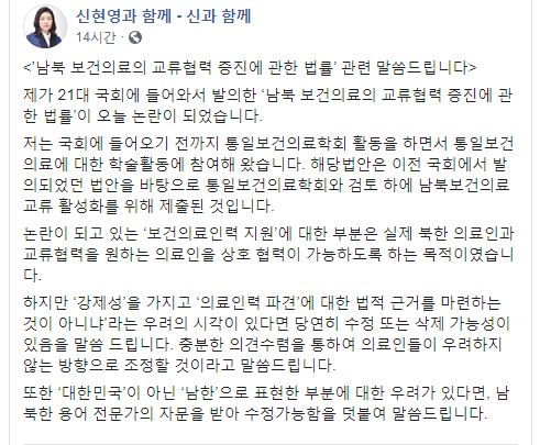 북한 의료인과 교류 협력을 원하는 의료인한에서 상호 협력이 가능하도록 하는 목적이며 강제성을 갖고 의료인력을 파견에 대한 법적 근거를 마련하는 것이 아니다. 당연히 수정 또는 삭제가 가능하다고 밝히며 충분한 의견수렴을 통하여 의료인들이 우려하지 않는 방향을 조 조정할 것이며 대한민국, 한국 이아닌 남한이라는 언어로 표현하여 이 부분도 수정이 가능하다고 자신의 페이스북을 통해 공식 해명하였다.