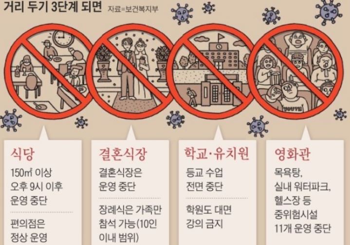 일반음식점 휴게음식점들은 9시 이후 포장 영업만 허용 커피전문점들은 매장 내 음료 섭취 금지 고위험 시절 집합 제한 학원 등 비대면 수업만 허용