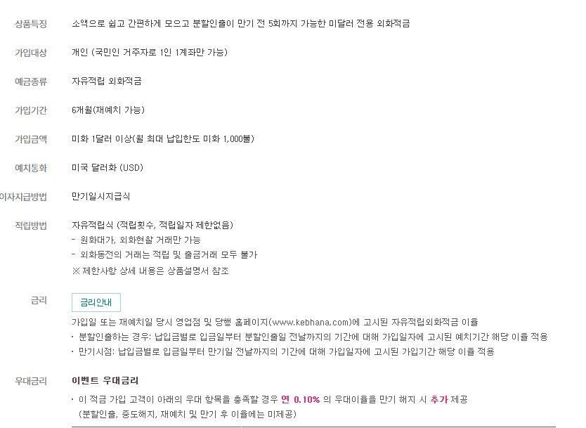 또한 현재 하나읜행은 내년3월 2일 까지 가입할 경우 연0.1%의 이벤트 금리를 추가로 제공한다고 밝히고 있어 많은 이들이 하나은행 달러 적금을 선호하는 추세이기도 하다