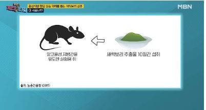 알코올성 지방간을 가지고 있는 쥐에게 새싹보리추출물을 10일간 먹인후 간 조직재 중성지방이 약 26%감소한 것으로 연구결과가 나타났다. 또한 알콜 해독에도 많은 도움이 된다.