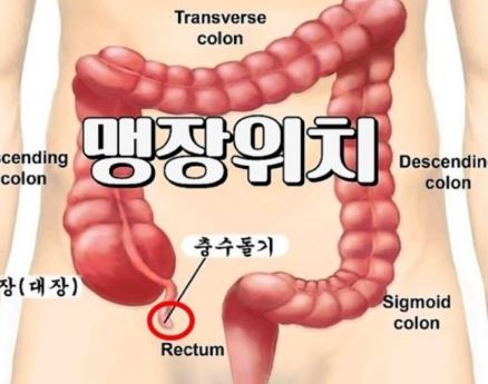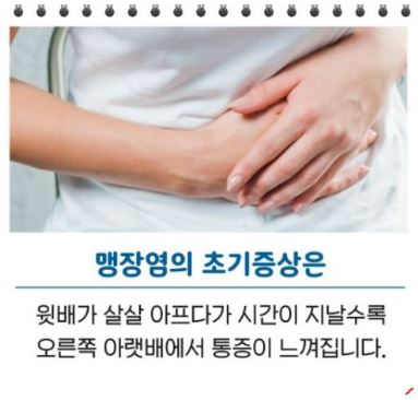 맹장염을 다른말로 충수염이라고도 하며 위치상으로는 오른쪽 갈비뼈에 위치해 있으며 증상으로는 95%이상이 복통을 유발하며 이외 식욕부진 오심 구토가 있으면서 국소적으로 복부 압통과 발열이 있다. 복통은 초기에는 상복부 통증이 일어나면서 점차 우측 하복부로 국한되어 통증이 발생한다.