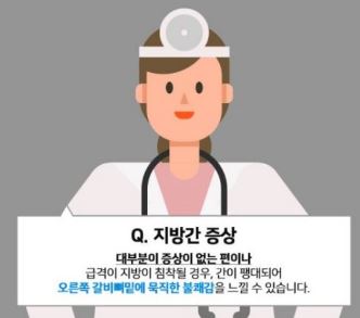 해부학 위치상 왼쪽에는 위와 심장이 있으며 오른쪽에는 대표적으로 간이 위치해 있습니다. 간과 관련된 질병이 발생하였을 경우에 아픔을 느낄수 있는데. 대표적인 질환으로는 지방간으로 지방간은 뚜렷한 증상이 없다가 어느정도에 병이 진행된 후에 고통을 느끼거나 응어리 같은 것이 느껴질수있어 초기에 발견하기는 여려운 질병중 하나이다.
