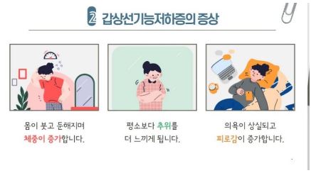 -갑상선기능저하증은 치료를 하지 않거나 진단이 늦었을 경우에 심장질환, 의식불명등의 치명적인 합벼증을 초래할수있으므로 반드시 치료를 해야한다
