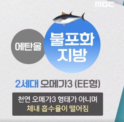 2.세대 오메가3의 경우 천연 모에가3 형태가 아니며 체내의 흡수율이 떨어짐 포화지방산의 함량은 떨어지지만 에탄올첨가해 체내 흡수율이 떨어짐