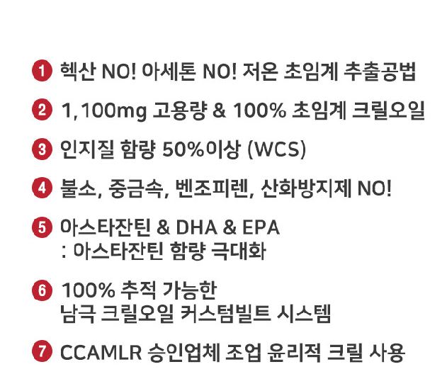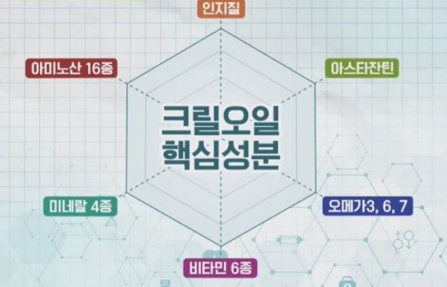 크릴은 작은 새우 같이 생긴 갑각류의 한종류로 크릴 새우는 먹이사슬의 최하단에 있기 때문에 크릴오일을 먹어도 중금속 노출의 위험도가 가장 적은것으로 알려져 왔다 크릴오일의 아스타잔틴 성분은 항상화 성분으로 염증을 줄이고 콜레스테롤 수치를 낮춰주며 또한 노화방지와 예방에 효과적인것으로 이야기되 있다.