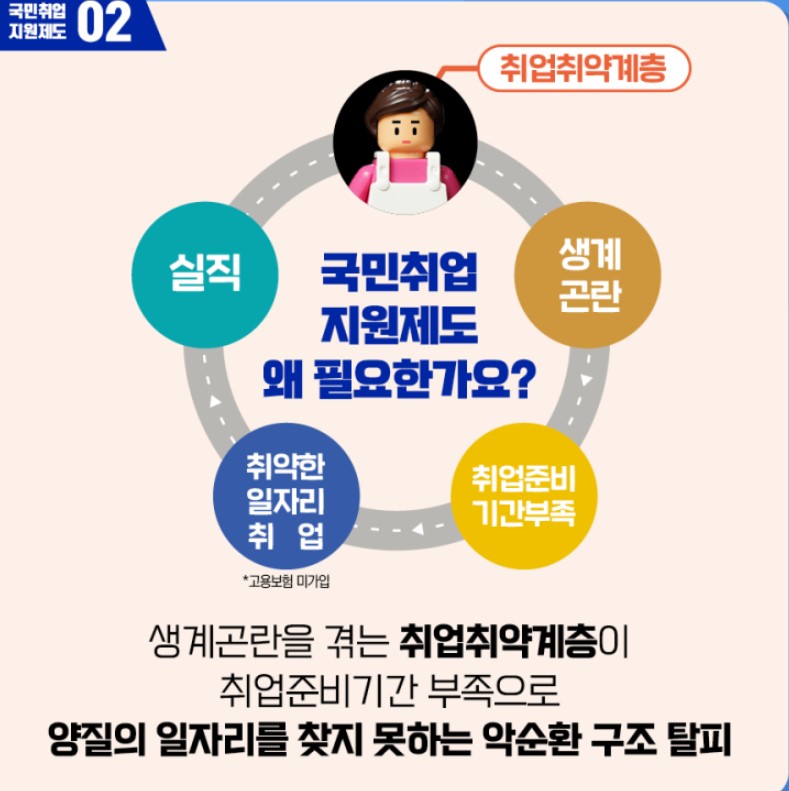 국민취업지원제도는 저소득 구직자, 청년, 경력, 단절 여성등 고용보험 사각지대에 있는 취약계층 구직자에게 정부가 1인당 월50만원씩 60개월 동안 구직촉진수당을 지급하고 취업 지원서비스를 제공하는 제도이다.