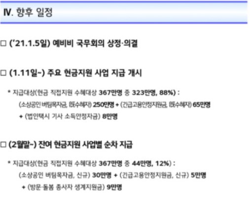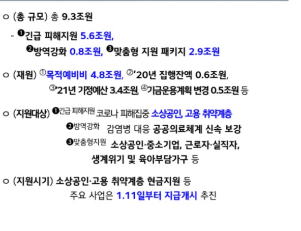 1.정부의 방역조치로 인하여서 영업금지 또는 제한되었거나 매출이 감소한 연매출 4억원 이하의 소상공인들에게 현금으로 지급