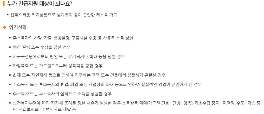 갑자스러운 위기 상황으로 생계유지 등이 곤란한 저소득 위기가구를 신속하게 지원 조기에 위기 상황에서 벗어나게 함으로써 가정해체나 만성적 빈곤 등을 방지하는 제도 코로나로 인해서 한시적 긴급복지지원제도라고 불리고도 있으며 지원자격도 대폭 완화하였다