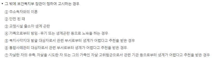 - 보건복지부령에 따라 지자체 조례로 정한 사유가 발생한 경우 소득활동 미미(가구원 간호, 간병, 양육) 기초수급 중지, 미결정, 수도, 가스 중단, 사회보험료, 주택임차료 체납 등