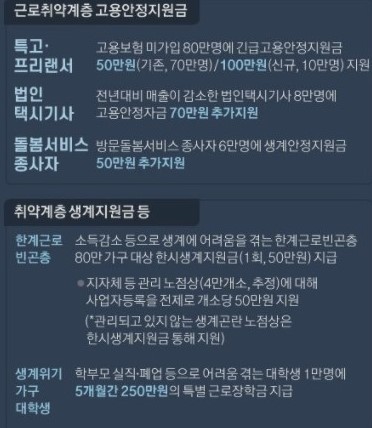 저소득층 한시생계지원금은 코로나 19로 인해 생계가 어려운 저소득층을 위해 마련된 복지 제도로써 기존 복지 제도를 받지 못한 저소득층을 위해 정부에서 생계지원금을 한시적으로 지원해줍니다. 정부에서는 저소득층 80만 가구를 위해 한시생계지원금을 50만 원 지급할 계획이며 총예산은 4066억 원에 해당합니다