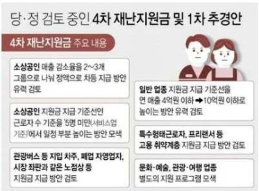 올해 26일 1차 추경이 국회를 통과하면서 소상공인에게 최대 500만 원까지 지급하는 4차 재난지원금이 29일부터 지급될 예정인데요. 이달 초 정부가 발표한 19조 500에서 1조 1000억 원 늘려 총 20조 6000억 원 규모로 집행되기 때문에 4차 재난지원금 대상이 확대되었습니다.