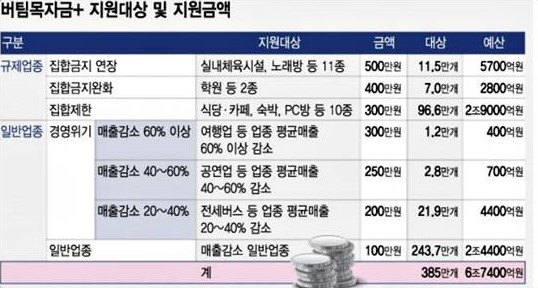 - 이번 재난지원금은 코로나19 바이러스 사태로 매출이 감소한 385만명의 소상공인,소기업에 ‘버팀목자금 플러스(+)’라는 이름의 재난지원금이 지급이 됩니다. 버팀목자금 플러스에만 총 6조7000억원 재정이 투입된다고 합니다.