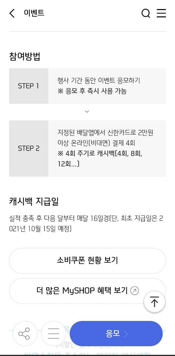 카드사별 홈페이지에서 바로 응모할 수 있습니다. 저는 신한카드를 이용해서 알아보았습니다. 아마 카드사에서 알림이 많이 왔을 테니 그 페이지에서 바로 외식 쿠폰 신청할 수 있을 것입니다. 그리고 기존에 신청한 적이 있었다면 자동으로 응모도 되어 있습니다.