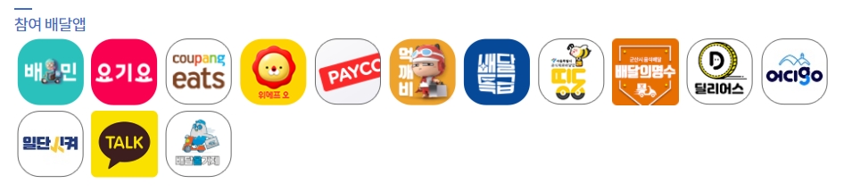 공공배달앱은 배달특급, 띵동, 배달의 명수, 일단시켜, 어디go, 배달올거제, 배달모아, 불러봄내, 배슐랭, 배슐랭세종, 대구로 입니다. 공공민간혼합 배달앱은 위메프오, 먹깨비이며 민간 배달앱은 배달의 민족, 요기요, 쿠팡이츠, PAYCO, 딜리어스, 카카오톡주문하기 입니다. 이들 앱을 이용해서 외식쿠폰 신청한 카드로 주문하고 결제하면 됩니다.