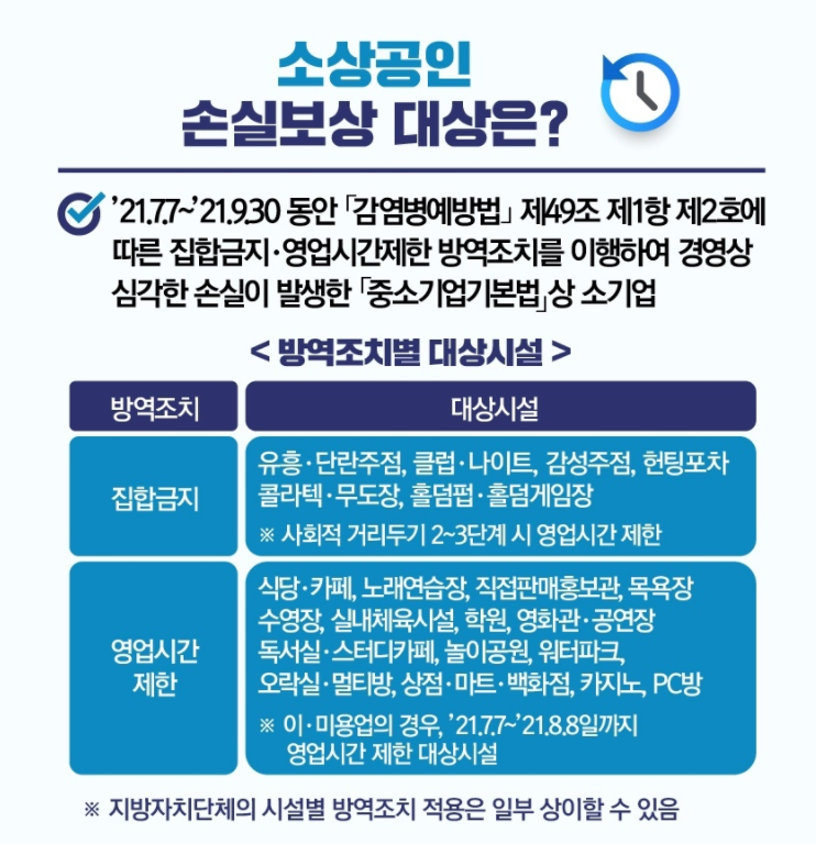 소기업을 대상으로 2021년 7월 7일~9월 30일까지 집합 금지 및 영업시간 제한 조치를 성실하게 지키다가 손실이 발생된 소상공인과 소기업이 그 대상입니다