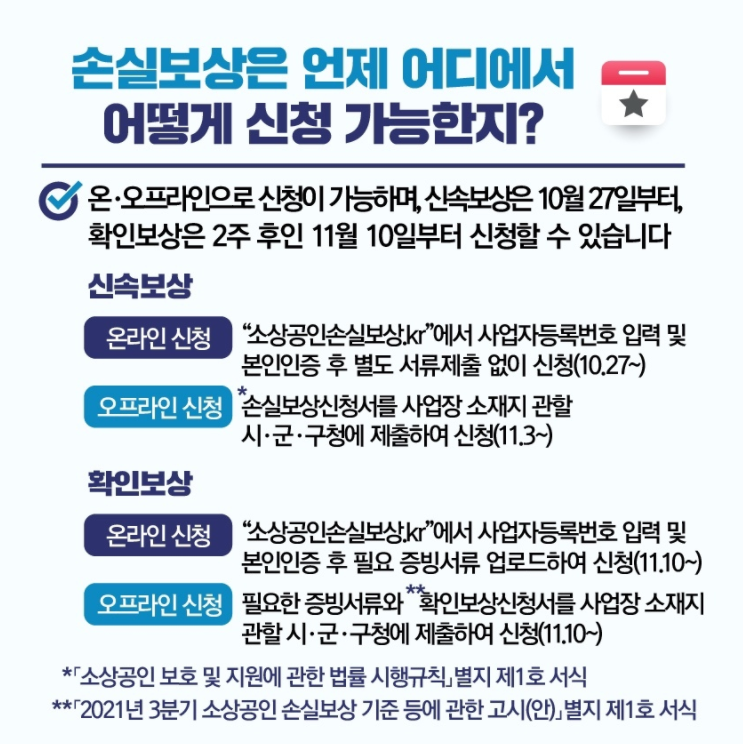 온. 오프라인으로 신청이 가능하며 신속 보상은 10월 27일부터 확인 보상은 2주 후인 11월 10일부터 신청이 가능합니다. 또한 온라인 신청이 어려운 소상공인들을 위해 시. 군. 구청에 설치되어 있는 손실보상 전담창구에서 오프라인으로도 신청. 접수를 받을 계획입니다