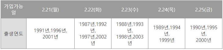 정식 출시 첫 주는 2월21~25일까지는 5부제 가입방식이 적용됩니다.