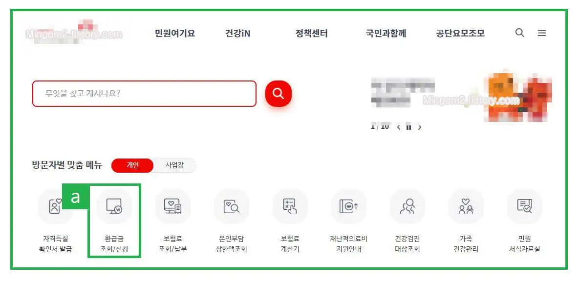 자기부담금 환급금을 조회 및 신청하려면 국민건강보험 공단 홈페이지에 접속하여야 하는데요. 검색창에 검색하여도 좋고 검색하기 귀찮으신분들은 아래의 "국민건강보험 바로가기"를 통하여 홈페이지에 바로 접속하실 수 있습니다. 국민건강보험 공단 메인 페이지에서 아래 메뉴의 환급금 조회/신청(사진 a 참조)을 클릭하여 주세요