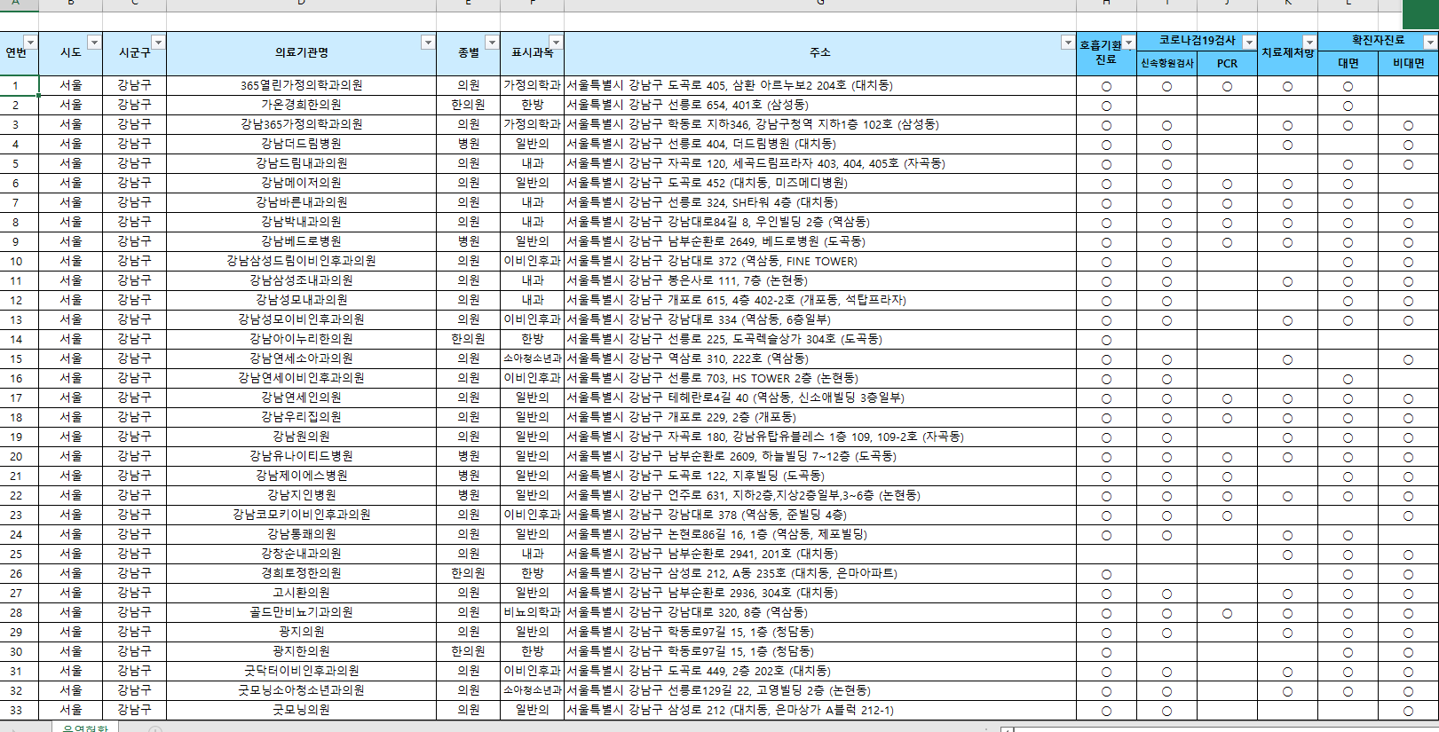 호흡기 환자진료 센터 운영현황 들어가셔서 전국 단위 검색하시면 대면 비대면 pcr 등 자세한 정보를 확인하실 수 있습니다