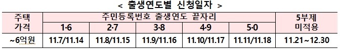 11월 7일부터 18일까지 주민등록상 출생연도 끝자리 기준 5부제로, 이후 11월 21일부터 연말까지는 출생연도와 상관없이 신청·접수를 받는다.